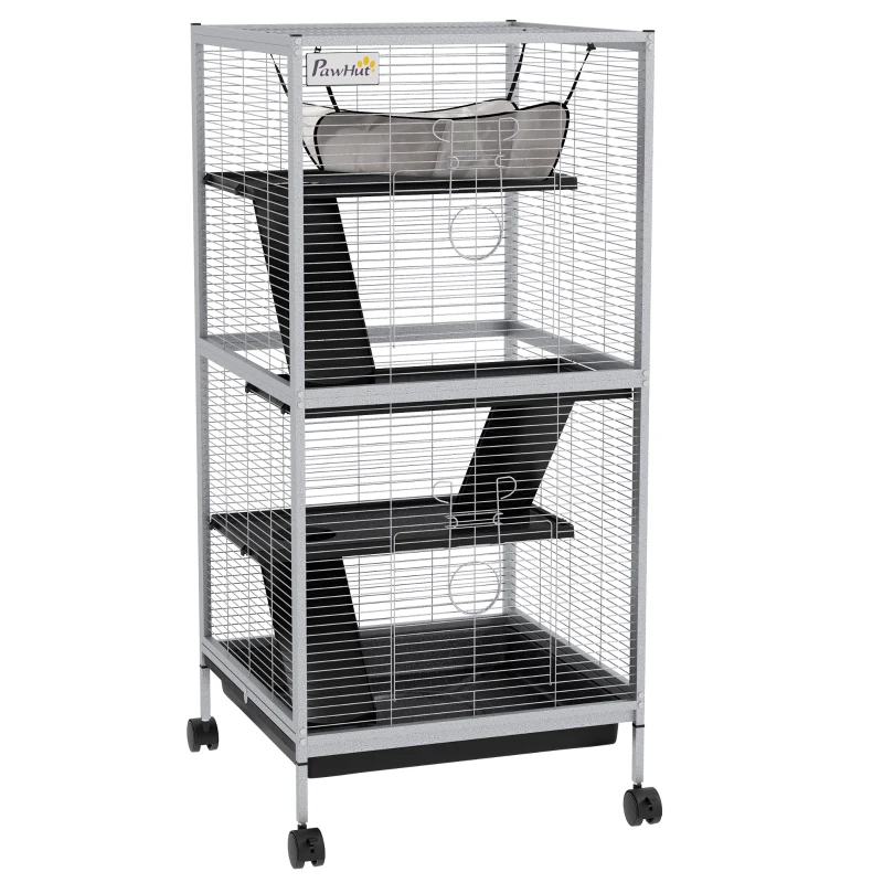 PawHut Cușcă pentru Porcușori de Guineea și Chinchilla, din Oțel, cu 3 Niveluri, Roți și Tavă Detasabilă, Gri Deschis